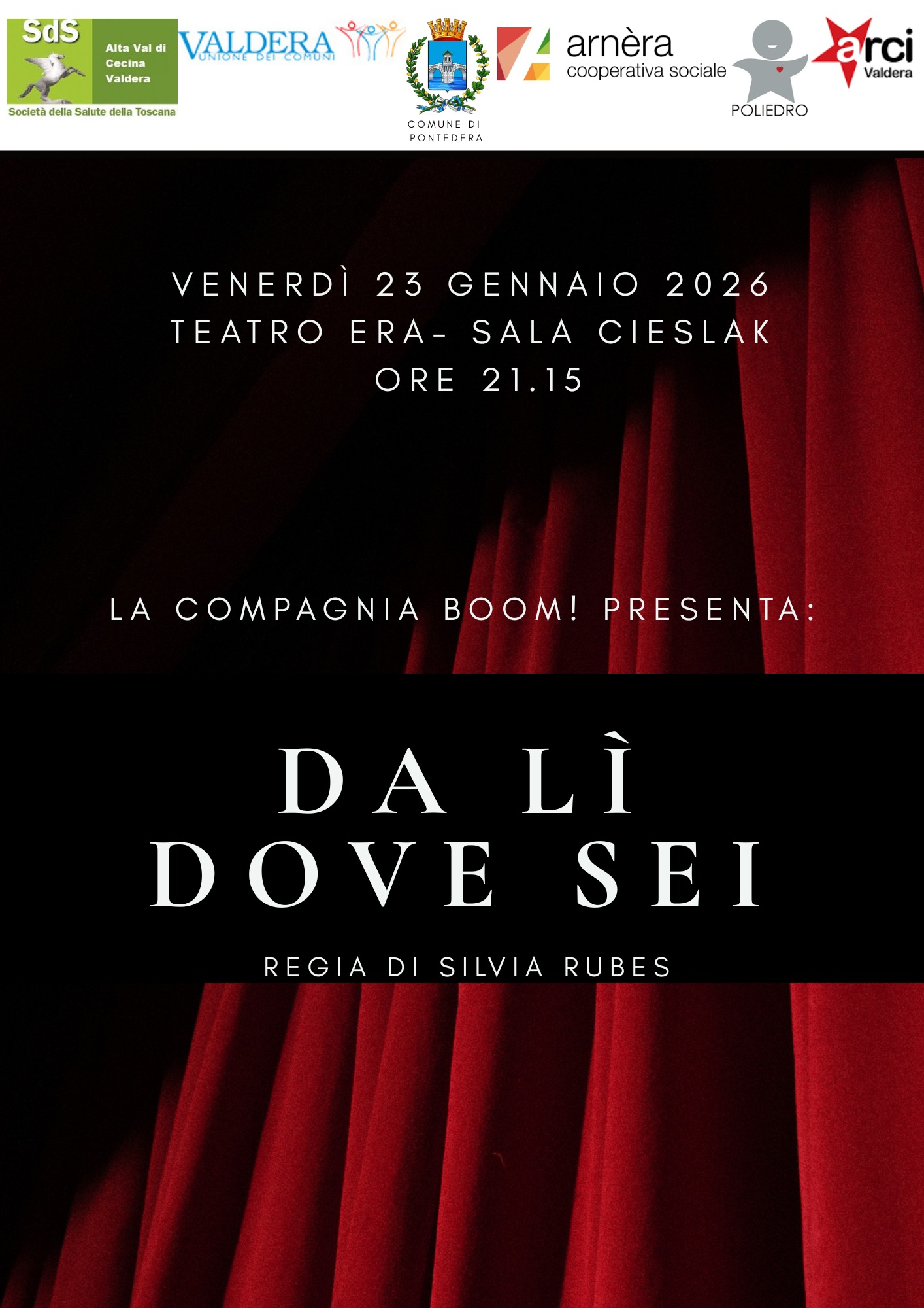 Venerdì 23 Gennaio torna a Teatro, con unspettacolo già sold out, la Compagnia Boom!, composta dai ragazzi e dalle ragazze di Centro Poliedro della Cooperativa Arnera e del Progetto Solidarietà di Arci Valdera, con la regia della nostra insegnate Silvia Rubes.