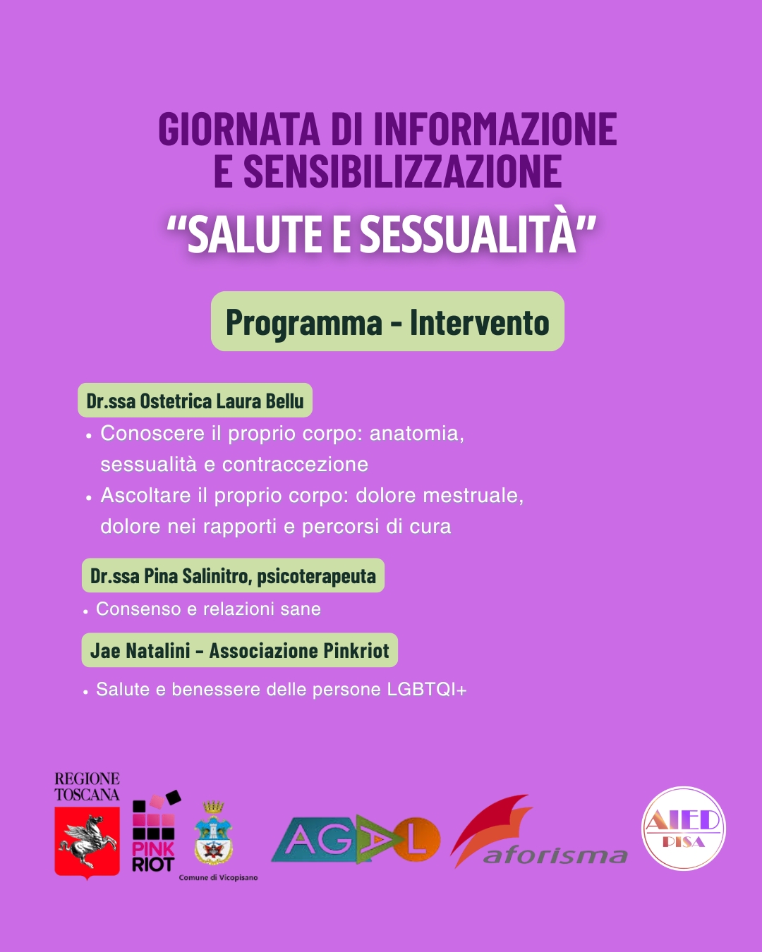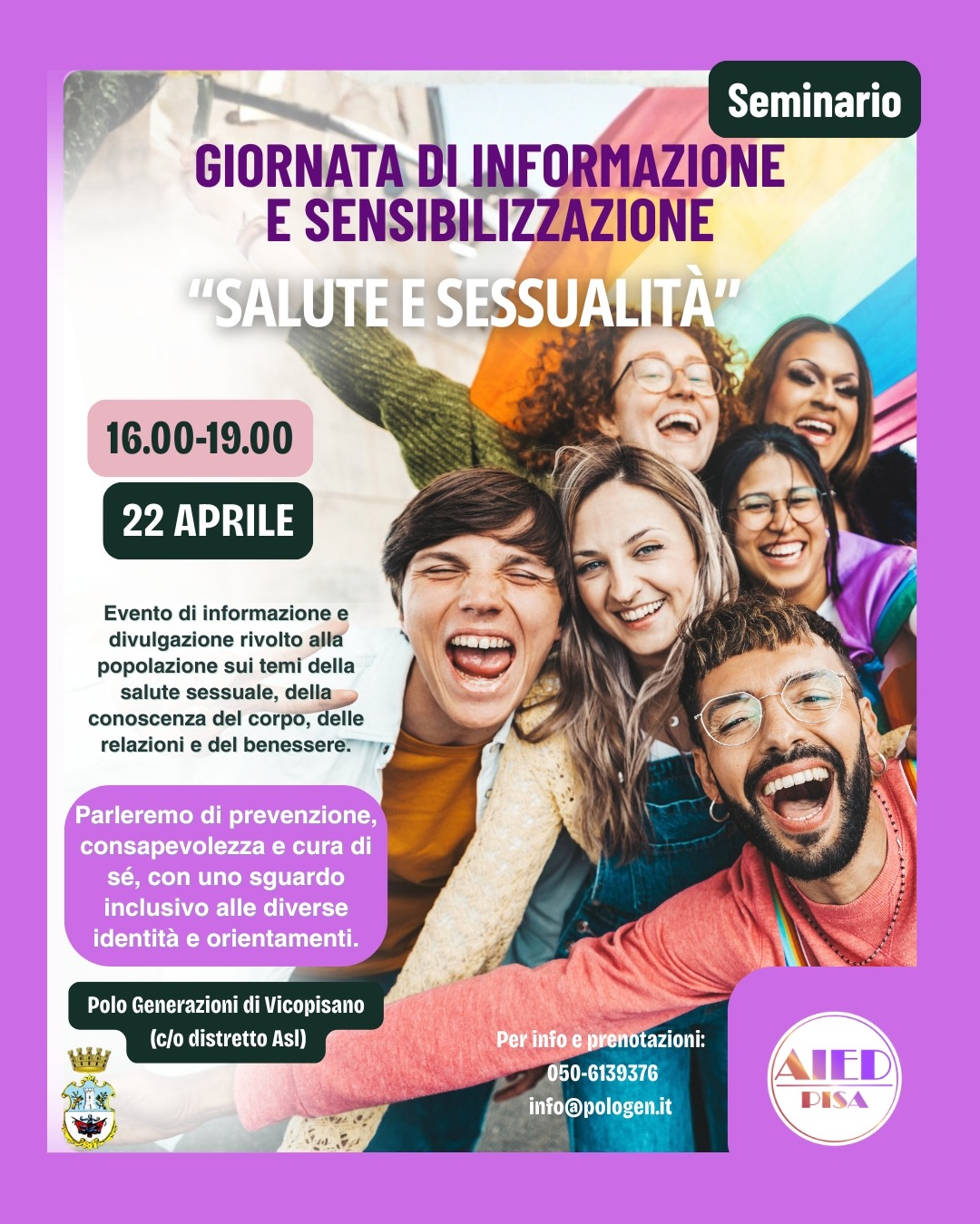 Martedì 22 aprile 2026, dalle ore 16.00 alle 19.00, presso il Polo Generazioni di Vicopisano (c/o distretto ASL), si terrà il seminario “Salute e sessualità”, un momento di informazione e confronto aperto alla popolazione.