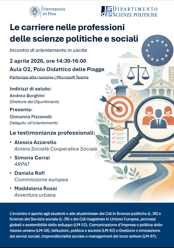 Ne parleremo il 2 aprile 2026 (14:30–16:00) durante un incontro di orientamento in uscita, con le testimonianze di professioniste che ogni giorno operano in ambiti diversi: cooperazione sociale, ambiente, istituzioni europee e innovazione urbana.