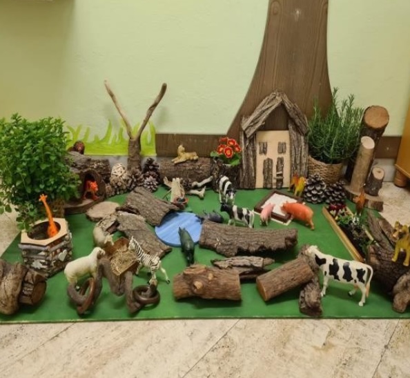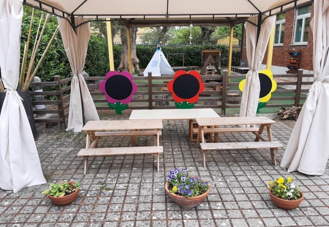 Lo spazio esterno è organizzato in angoli di gioco, zone ombreggiate, aree verdi, spazi per il gioco simbolico come la cucina di fango e zone dedicate allo scavo. Grande rilievo viene dato all’educazione all’aperto e alle uscite sul territorio, vissute come occasioni di scoperta, osservazione e avventura.