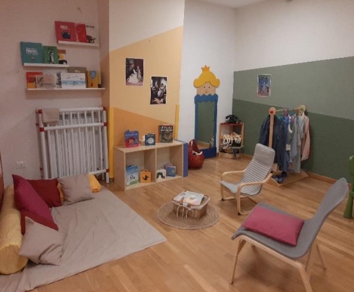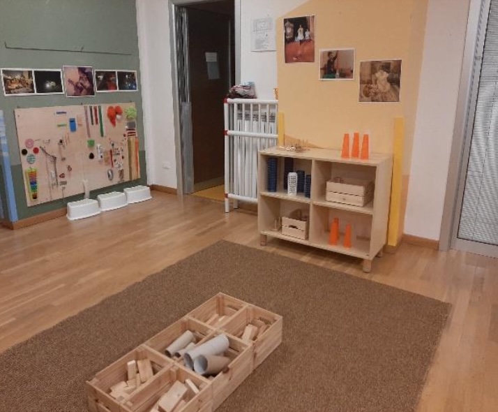 L’ambiente centrale polifunzionale è organizzato per centri di interesse: una zona pranzo e laboratorio con tavoli, uno spazio morbido, uno spazio per la lettura, uno spazio dedicato al gioco simbolico con travestimenti e cucina e una zona per il gioco euristico con materiali naturali e di recupero, ai quali viene dedicata particolare attenzione da parte dell’équipe educativa. Il secondo ambiente multifunzionale è utilizzato soprattutto per le esperienze motorie e per il riposo pomeridiano. Lo spazio esterno è concepito in continuità con quello interno e organizzato per promuovere diverse esperienze di educazione all’aria aperta. Sono previste anche pratiche di outdoor urbano con passeggiate educative a piccolo gruppo per l’esplorazione del quartiere e della città.